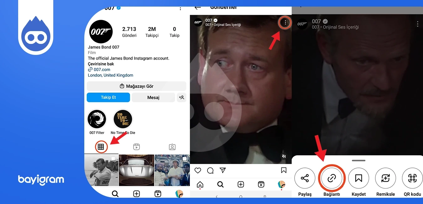 Instagram Gönderi veya Fotoğraf Instagram link kopyalama için: