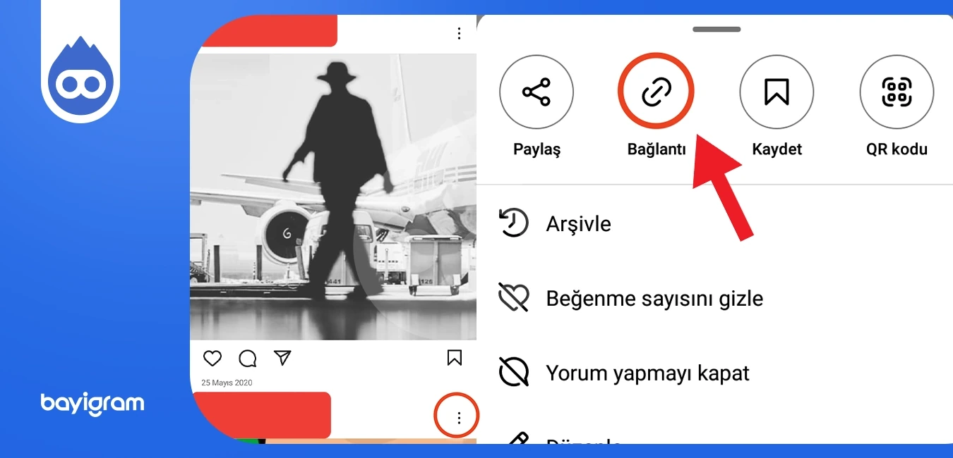 - Son olarak açılan menüde ‘Bağlantı’ kısmına bir kez dokunduğunuzda Instagram URL kopyalama yapılacaktır.