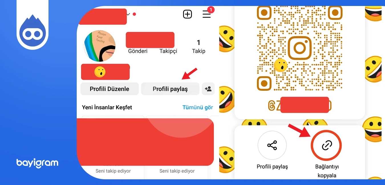 - QRcode olarak alan açılacaktır, bu alanda ister ‘Profili paylaş’ diyebilir isterseniz de ‘Bağlantıyı kopyala’ diyerek hesabın bağlantısını alabilirsiniz.