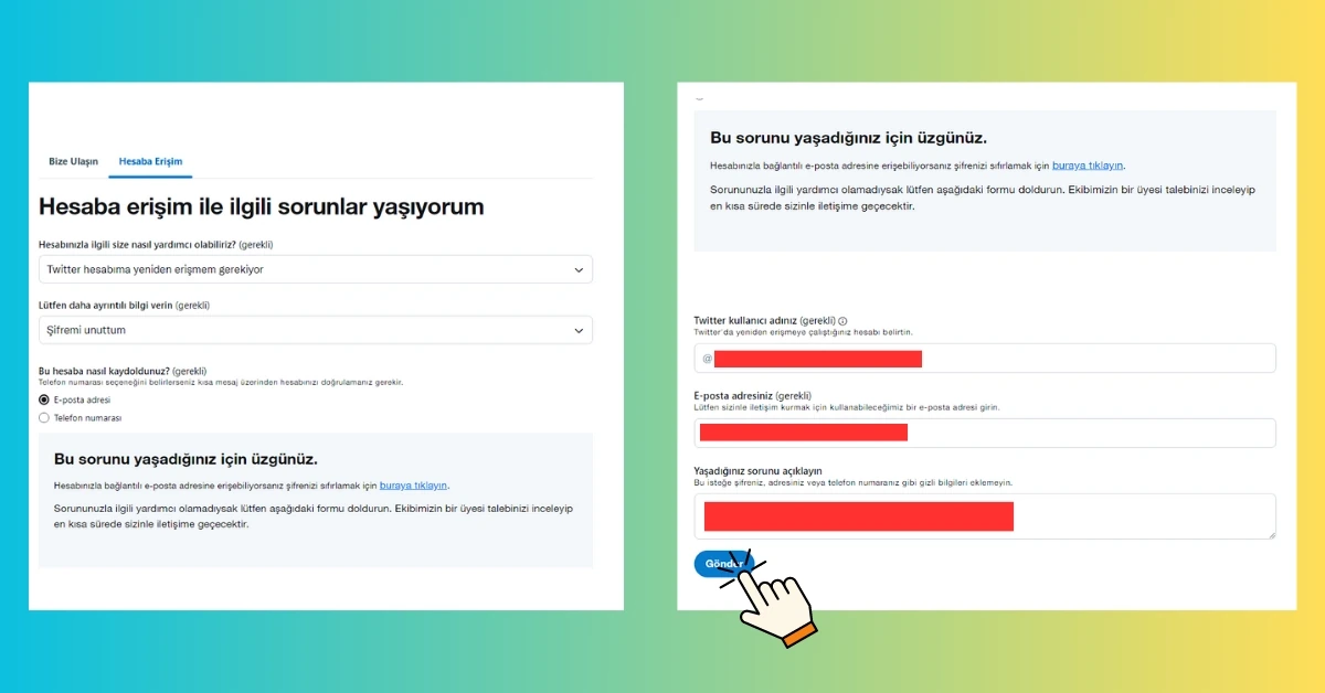 - ‘Hesaba erişim ile ilgili sorunlar yaşıyorum’ başlığının hemen altında yer alan kısımlara ilgili alanları doldurmanız gerekecektir.